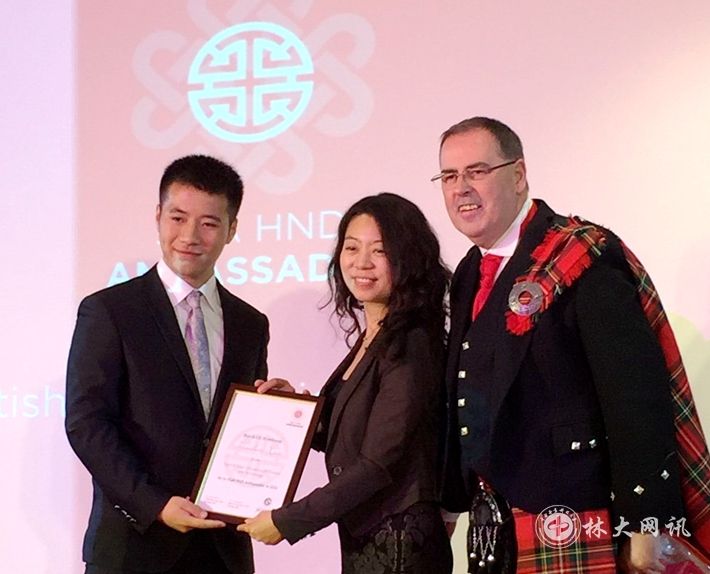 【林大网讯】 59,英国苏格兰SQA HND项目组与教育部中国留学服务中心在北京北辰洲际酒店联合举行了SQA HND 项目梦想大使授予典礼。我校国际学院肖主宸同学被授予了SQA HND 大使的“光荣称号”。